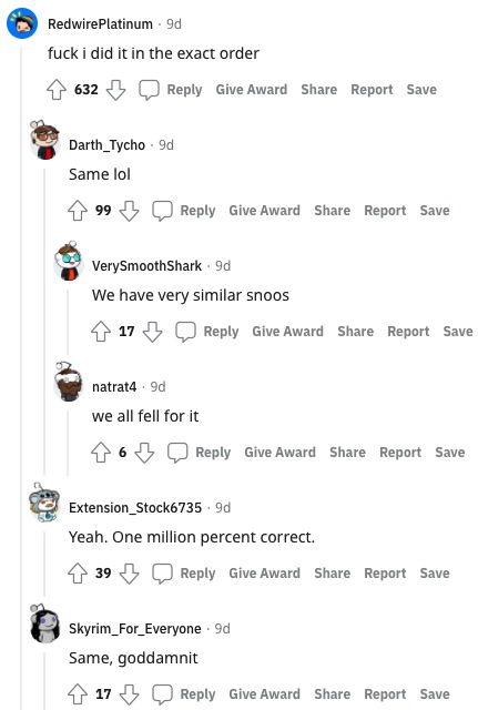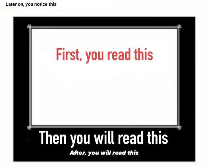 How was the designer of the image able to fairly accurately predict reading order? Some of that comes from the principles of bottom-up attention. The “First, you read this” text is an odd color, which you know will attract attention. Two other factors that help are that it has a large font and it occupies a central position. For various sorts of objects, all other things being equal, people will tend to look at the center image. This may be particularly true of designed images with a frame like this one, because we come to learn that designers often position the most important information in the center of a frame.