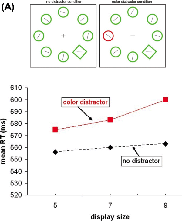 In some of the displays, Theeuwes (2010) included a circle that was different in color from all of the rest of the items on the display. The uniqueness of this color tended to attract attention. Because that meant attention was attracted away from the diamond, the results was an elevation in response time for reporting the orientation of the line segment in the diamond.