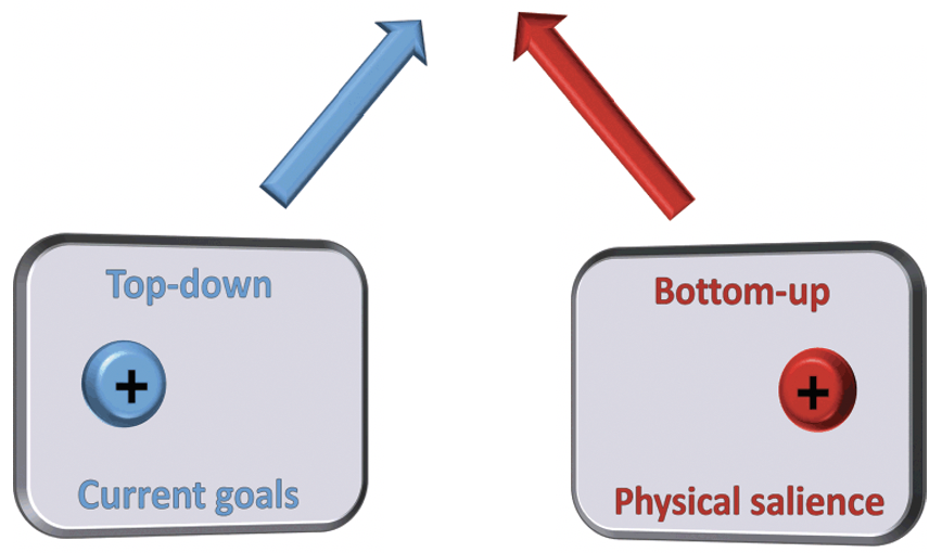 The signals of bottom-up and top-down attention must be somehow combined to determine where your attention ends up going.