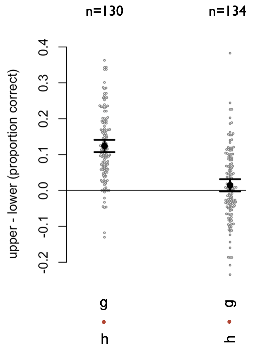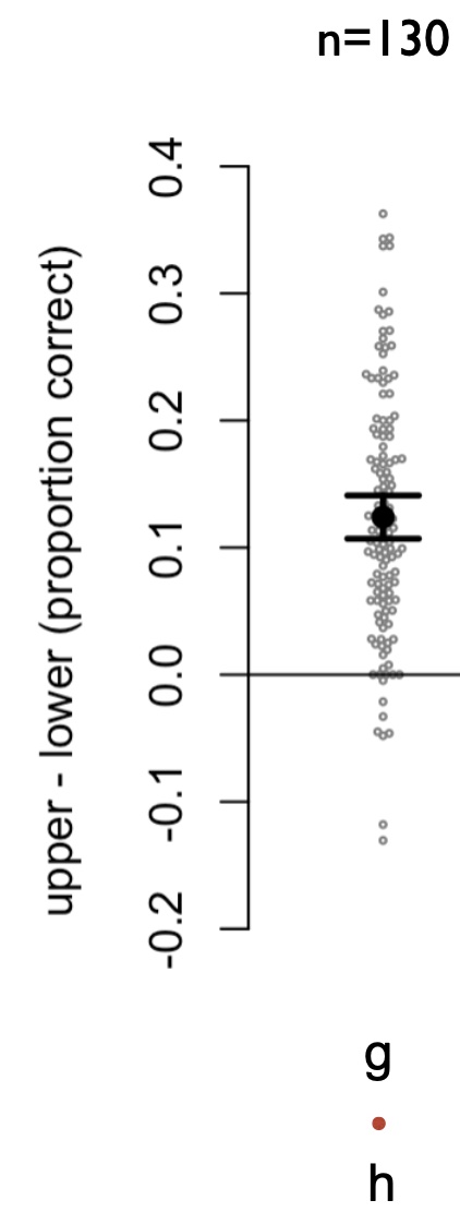 To examine whether there was any difference between the top and bottom positions, we subtracted each student’s performance on the bottom letter from that of the upper letter. Each dot in the below plot represents the difference score for one of the one hundred and thirty first-year students.
