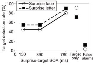 The black squares show the data for the participants who were shown a surprise letter. Participants did poorly if that letter was presented 130 or 390 ms before the letter, but they did fine if it was presented 780 ms later. In summary, the odd stimulus disrupted performance for something like half a second. During that interval, participants missed the target face about half the time.