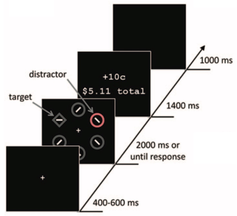 The best strategy for participants to maximise their earnings was to completely ignore the distractor and its color. You already know from chapter 5 that people can’t do that: the odd-colored distractor will slow them down. The new factor here was whether the distractor that indicated the reward would be 10¢ would affect people any differently than the distractor that indicated the reward for that trial would be just 1¢.
