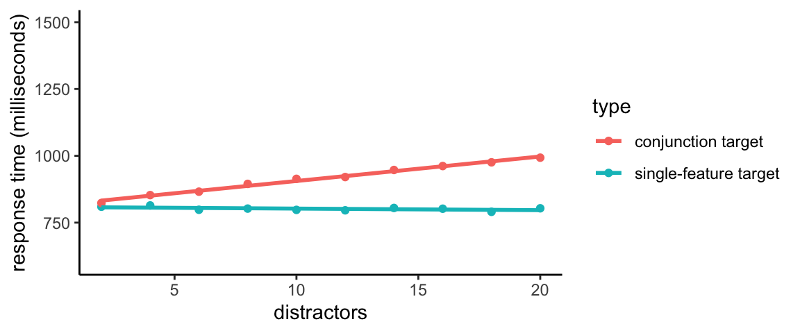 Instead of being able to rely on parallel processing to rapidly tell you where the target is, you have to bring limited resources to bear. Those resources can only process a few objects at a time (they impose a bottleneck). So, the more distractors there are, the longer it takes (on average) to find the target. The below plot shows the average response time as a function of number of distractors.