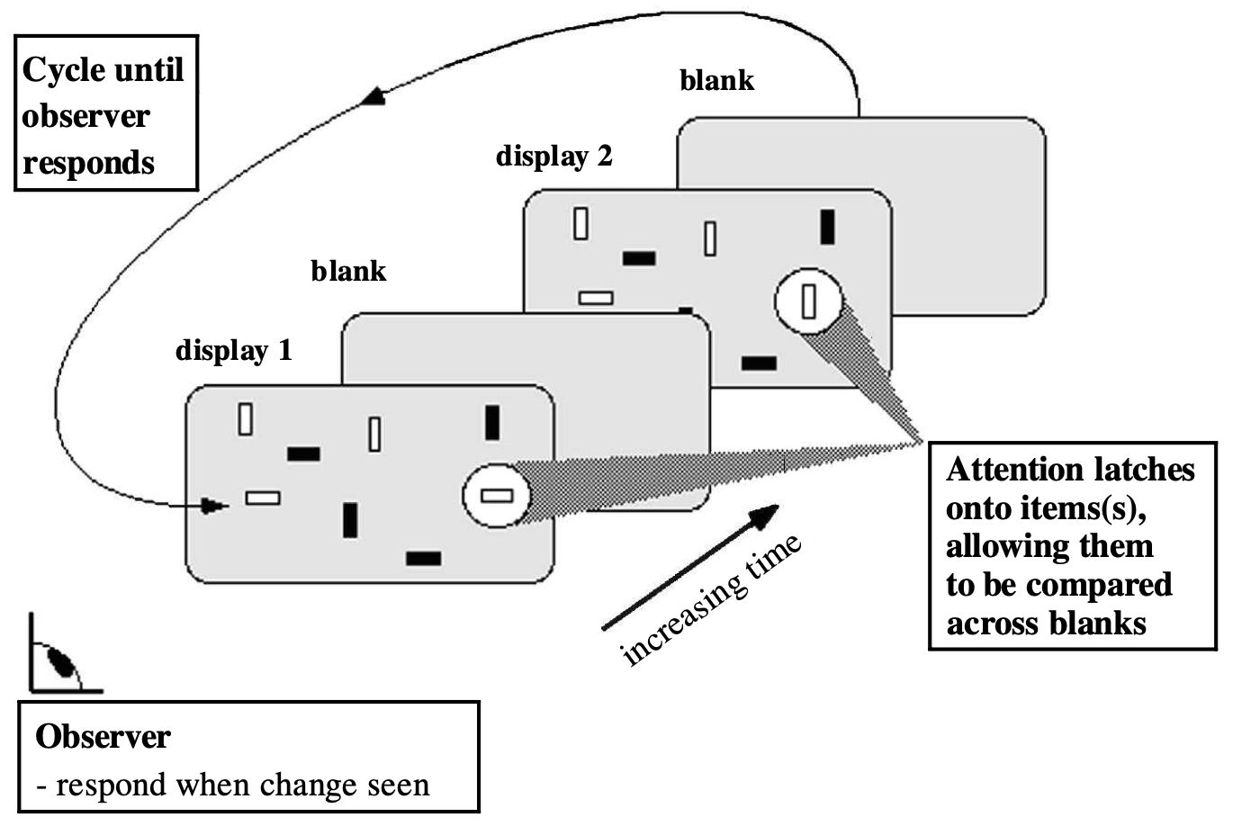 Rensink’s hypothesis was that this kind of evaluation process exists after the bottleneck, in the realm of very limited-capacity cognition. So he expected that evaluating whether a change is present can only be done for one or a few items at a time, by attentionally selecting that location so that its features would make their way to cognition where a comparison process could be done over time.